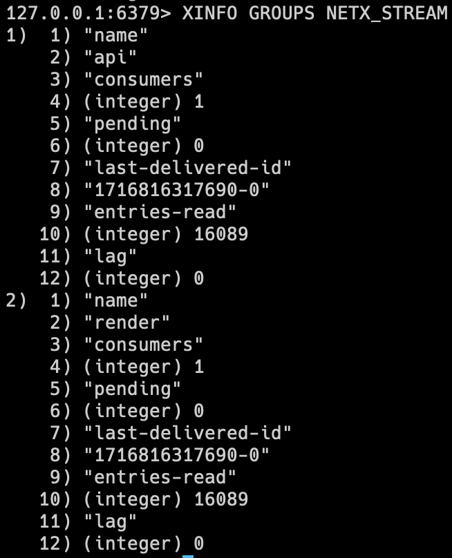 예를들어, gitanimals의 redis-stream GROUP을 보면, 1번에 해당하는 api 그룹은 "1716816317690-0" id까지를 읽었고, render 그룹또한 마찬가지임을 알 수 있습니다.